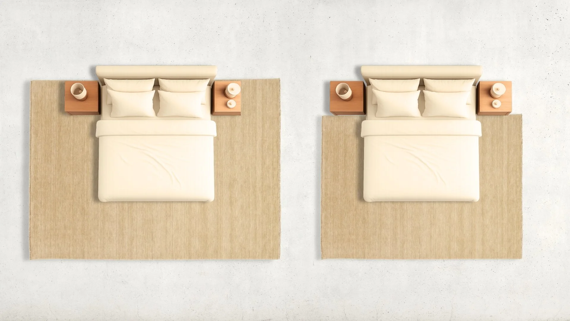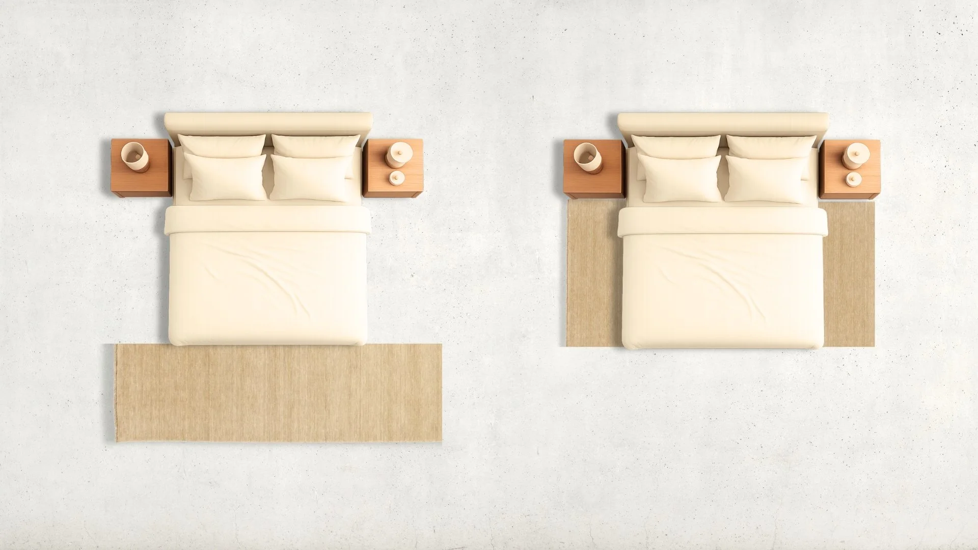 The rug layout for single beds depends on the shape and layout of the room. Ideally the rug should follow the longest wall of the room.